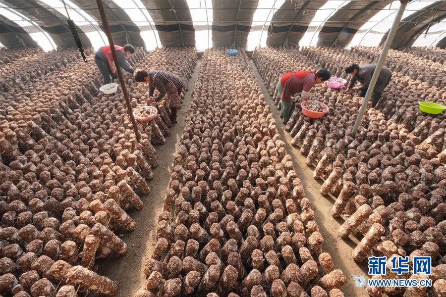 12月20日,唐山市丰润区小美食用菌种植农民专业合作社社员在大棚内采摘香菇。  新华社记者 牟宇摄