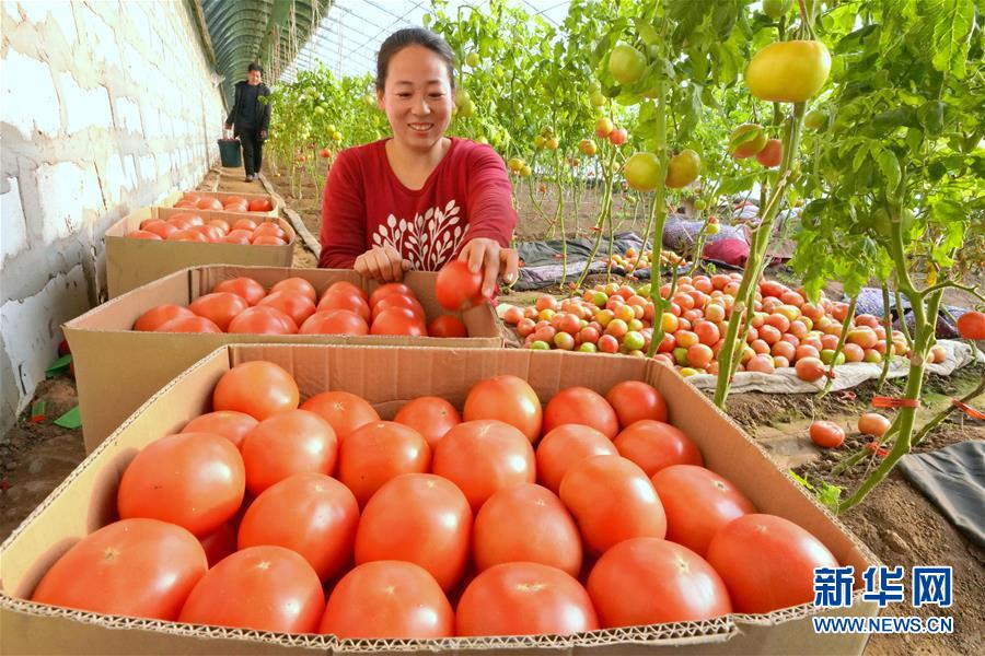 12月20日,唐山市丰润区百草坡农产品农民专业合作社社员在大棚内收获西红柿。 新华社记者 牟宇摄