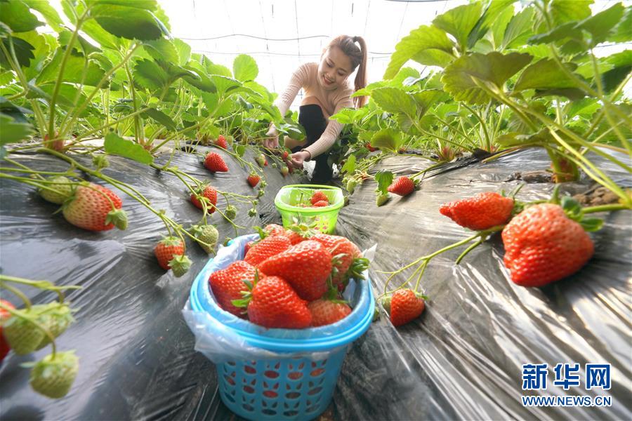 12月20日,游客在唐山市丰润区众浩草莓种植专业合作社大棚内采摘草莓。 新华社记者 牟宇摄