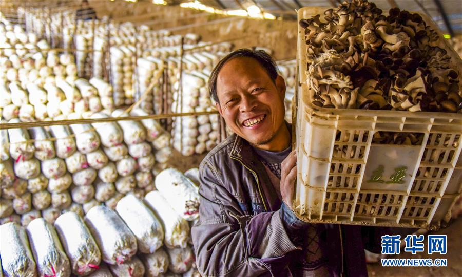 11月18日,在衡水市冀州区周村镇东高村食用菌种植基地的大棚里,村民在搬运蘑菇。