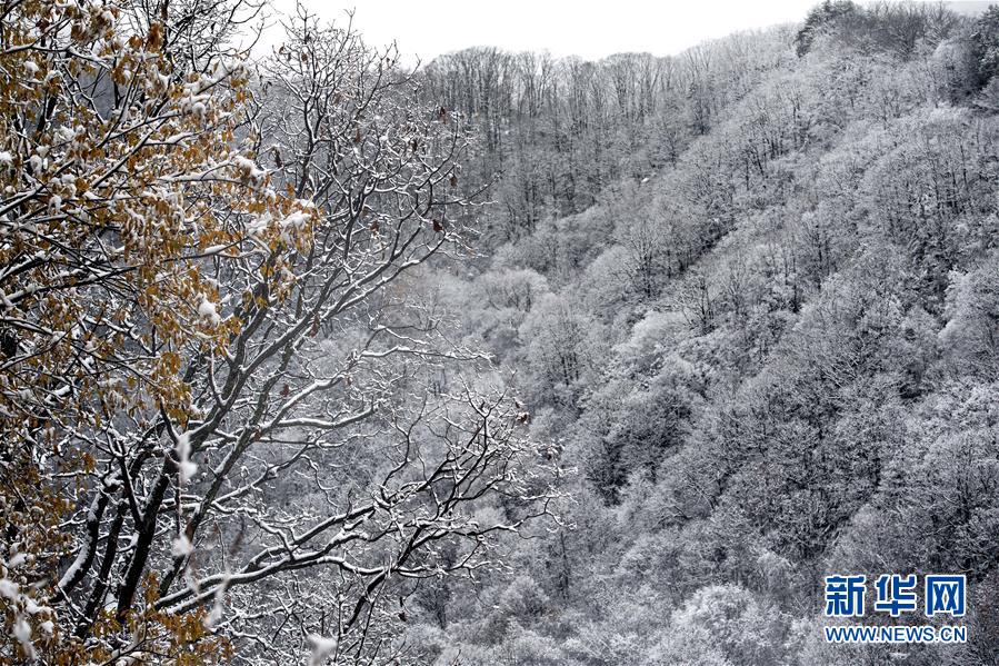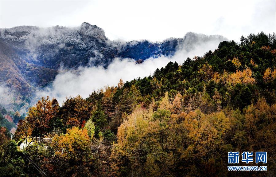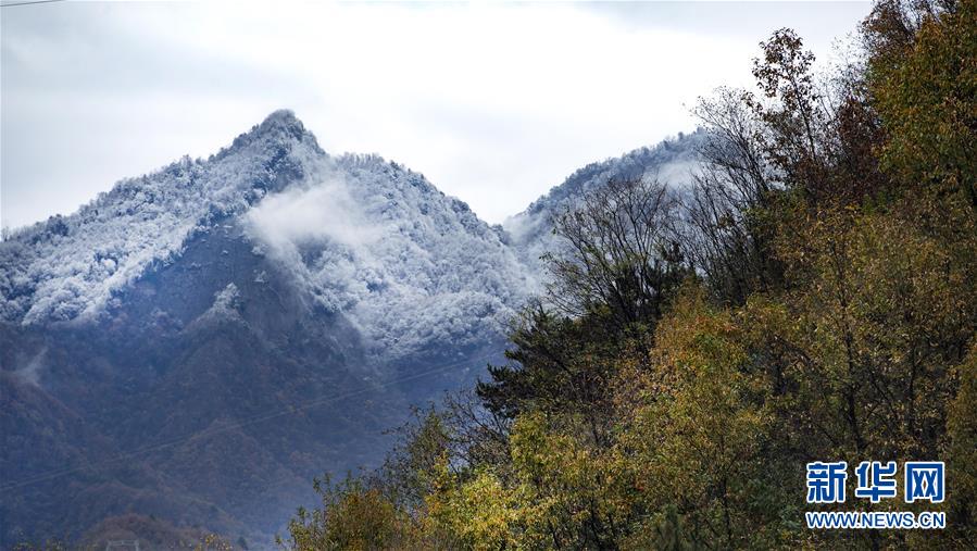 鬼谷岭国家森林公园山顶白雪覆盖,半山却是一派秋色(11月8日拍摄)。 新华社记者陶明摄