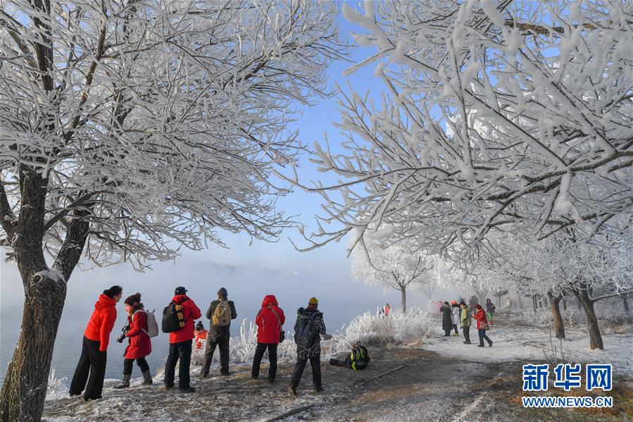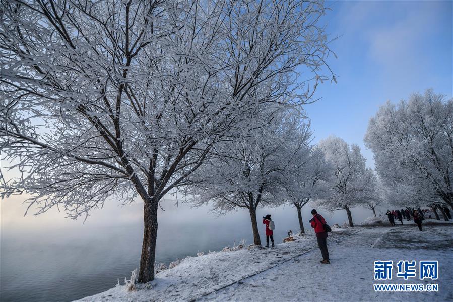 12月12日,游人在吉林省吉林市丰满区吉丰东路松花江畔观赏雾凇美景。 新华社记者张楠摄