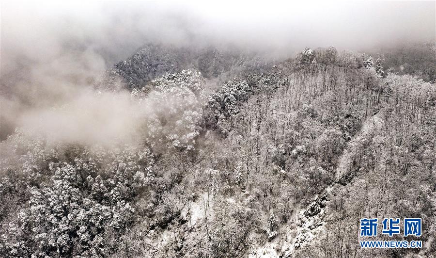 云雾中的鬼谷岭国家森林公园山顶白雪皑皑,山腰秋色正浓(11月8日无人机拍摄)。 新华社记者陶明摄