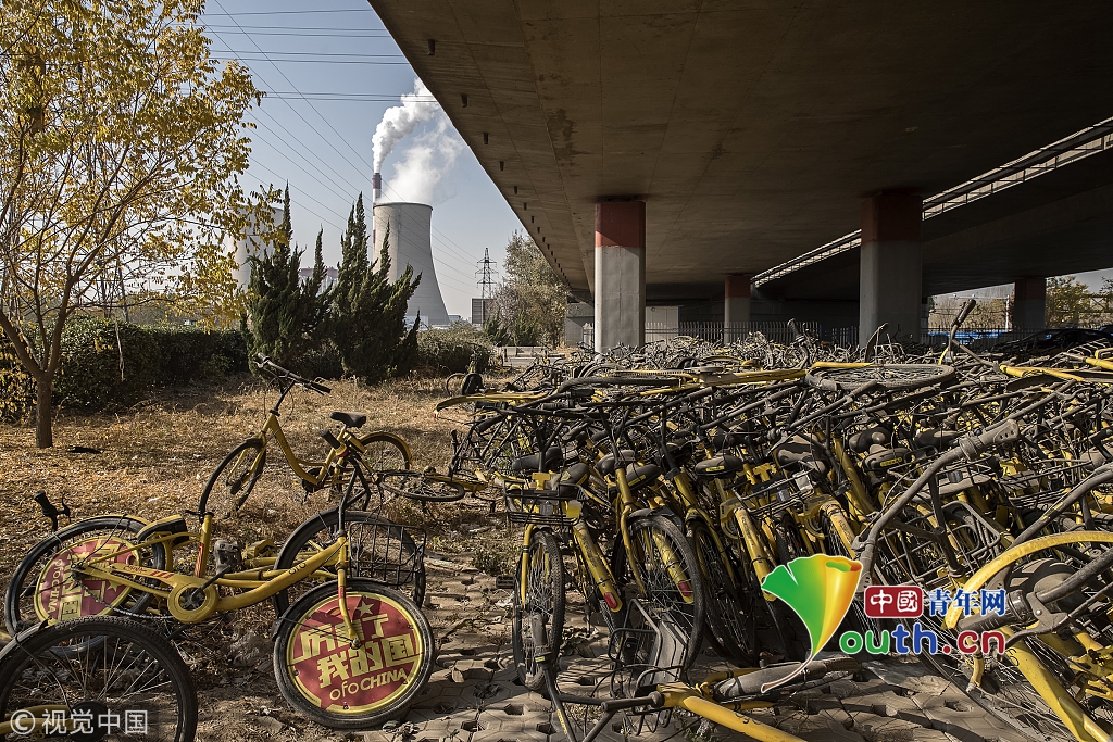 2018年11月22日,石家庄栾城。一座桥下的ofo小黄车堆积场。