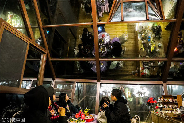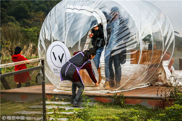 2018年12月17日,广西桂林,阳朔县遇龙河畔。主人引领游客走进泡泡屋。