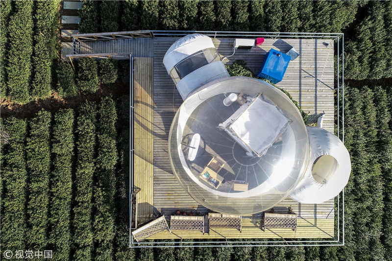 2018年12月18日,江苏常州金坛茅山百亩茶田中的帐篷酒店和泡泡屋美不胜收。这里打造的帐篷,泡泡屋极具特色,可以让游客与大自然零距离接触,这种形式的“酒店”十分撩人,深受欢迎。韩加君/视觉中国