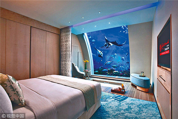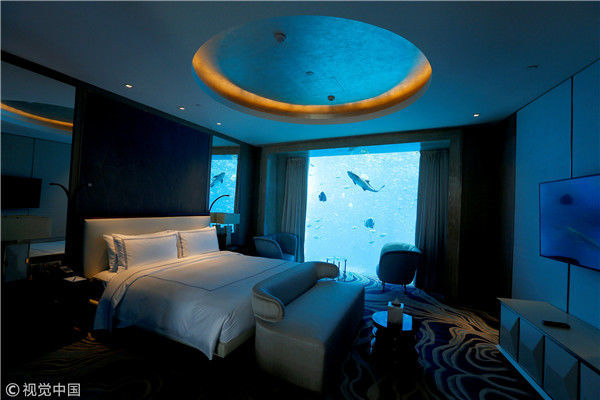 2018年4月25日,海南三亚,亚特兰蒂斯酒店的海王星水下套房,鱼在窗外游泳。