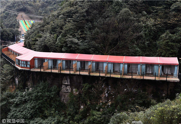 2017年11月16日,重庆万盛一景区内的临崖酒店依山而建,色彩绚丽如山间彩虹。据介绍,该酒店位于当地奥陶纪景区内,酒店顺着山形而建盘旋在山间,特别显眼。 周毅(重庆分社)/中新社/视觉中国