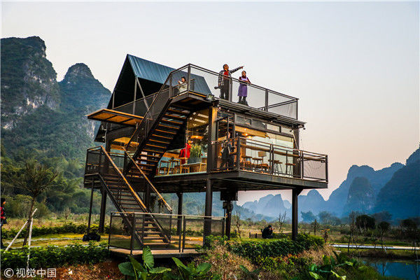 2018年12月17日,广西桂林,阳朔县遇龙河畔。黄昏时分,游客站在观景台观赏泡泡屋及周边景观。
