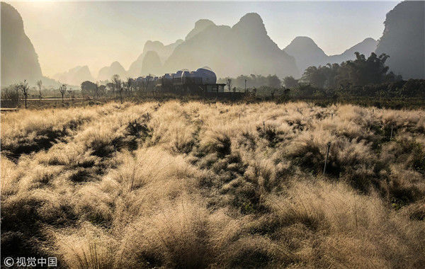 2018年12月18日,广西桂林,阳朔县遇龙河畔。晨光中的泡泡屋配套景观——粉黛子。