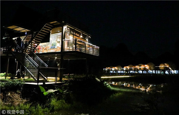 2018年12月17日,广西桂林,阳朔县遇龙河畔。夜色中的泡泡屋观景台。