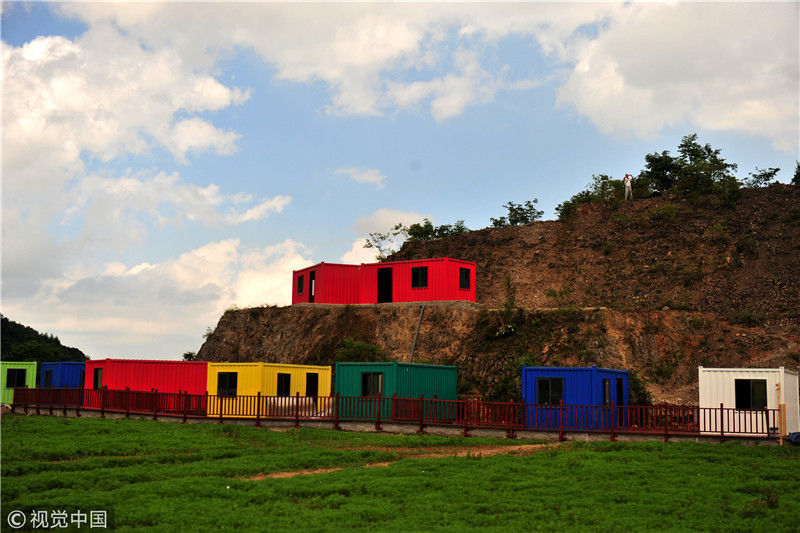 2018年6月9日,湖北省宜昌市夷陵区樟村坪镇羊角山村“云上西寨”康养绿地正在建设的“集装箱”民俗项目区风景。张国荣/视觉中国
