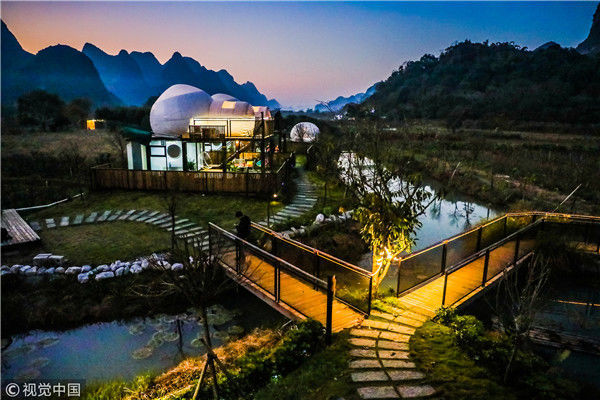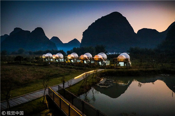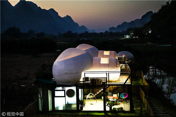 “泡泡屋”列阵阳朔河畔 游客可躺在床上看星星