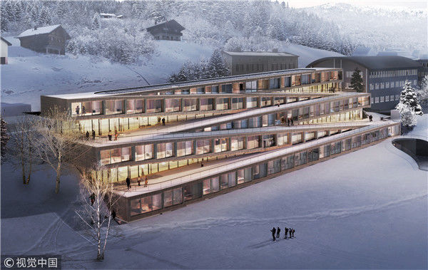 2018年5月30日讯,Bjarke Ingels Group ( BIG )将在瑞士新建一家酒店,成“之”字形的屋顶同时也是滑雪道。酒店占地 70000 平方英尺,由五个连续的“之”字形部分组成。在建筑外部,它们同时也是一条从屋顶通向地面的路径。冬日里覆雪的屋顶就成为了雪道,它直通向钟表匠小路( Watchmaker's Path )——这一通道是经历史上的制表要塞启发而建——延伸了原有的滑雪区域。