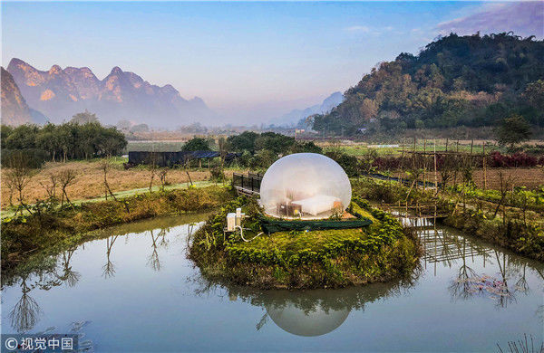 最近这几年,中国的民宿风越刮越猛,各地精品民宿纷纷如雨后春笋一样冒出了,而且他们用其更独特的设计感吸引着人们的目光。其实对比星级酒店,民宿最大的优势,就是设计风格更独特,更具艺术感,也更符合人们的审美要求,同时又能做到比星级酒店更舒适,更适合度假,所以大家现在出行都更热衷于选择民宿。图为2018年12月18日,广西桂林,阳朔县遇龙河畔。晨光中的泡泡屋。棋簿紫/视觉中国