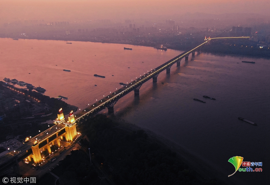 2018年12月13日,江苏南京,“一桥飞架南北,天堑变通途。”作为我国第一座自行设计和建造的双层铁路、公路两用桥,南京长江大桥在我国桥梁史上的重要地位不言而喻。从1968年建成后的48年间,它就如同一条巨龙,始终在长江上默默守护着人来车往。南京长江大桥上层是公路桥,下层为双轨复线铁路桥,连接津浦铁路与沪宁铁路干线,是我国南北交通要津和命脉。近年来,由于南京长江大桥公路桥的实际通行荷载远超原先设计标准,不仅桥面上拥堵常现,桥梁本身的种种“病害”也日益加深。图为2018年12月13日,夜幕降临,南京长江大桥归位后的玉兰花灯重新点亮。大桥玉兰花灯柱共有299根,每根灯柱上有5盏玉兰花灯,1大4小,一共1495盏。方东旭/视觉中国