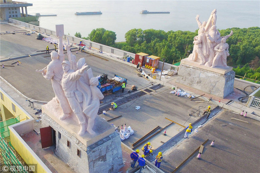 2018年6月24日,南京长江大桥修葺一新的淡粉色的工农兵雕像。