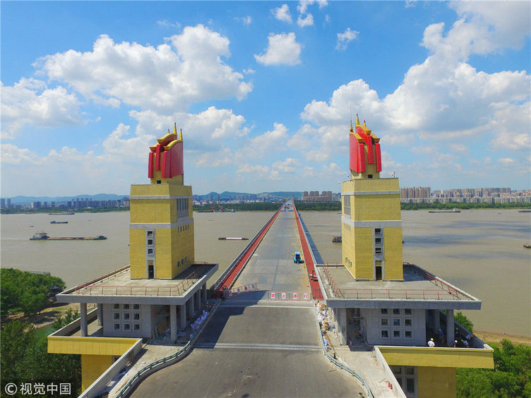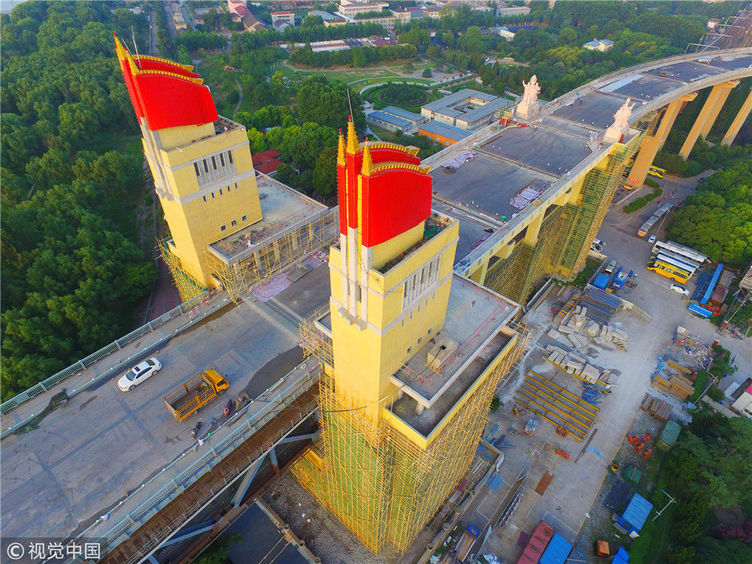 2018年6月24日,南京长江大桥修葺一新的米黄色桥头堡,鲜艳的三面红旗。