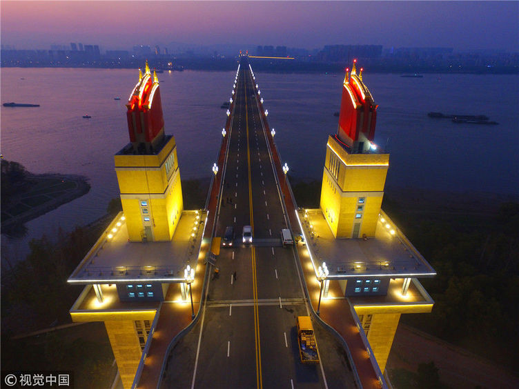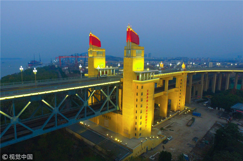 2016年10月28日晚,服役48年的南京长江大桥正式封闭,进入合同工期长达27个月的改造提升期。身为我国桥梁建设领域的扛鼎之作,南京长江大桥的此次封闭改造牵涉到公路繁忙、铁路风险、技术攻关、文物保护等诸多难点,不仅影响面广,而且社会关注度极高。如今,随着整个工程进入收尾阶段,即将于2018年12月底正式通车。图为2018年12月13日,夜幕降临,南京长江大桥归位后的玉兰花灯重新点亮。大桥玉兰花灯柱共有299根,每根灯柱上有5盏玉兰花灯,1大4小,一共1495盏。