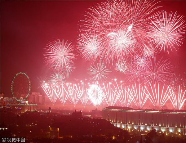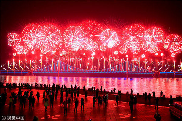 2017年12月31日,黑龙江黑河。近万民黑河市民和数十名俄罗斯游客,身穿“中国红”在中央街跳起热舞迎接新年。