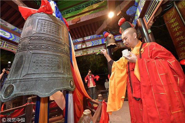 2017年1月1日零时许,海南三亚南山举行撞钟祈福迎新系列民俗文化活动,南山寺僧众和游客敲响108响吉祥钟声,祈福国泰民安,迎接2018年的到来。
