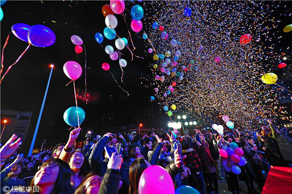2017年12月31日,天津大悦城,市民们放飞气球,迎接2018的到来。