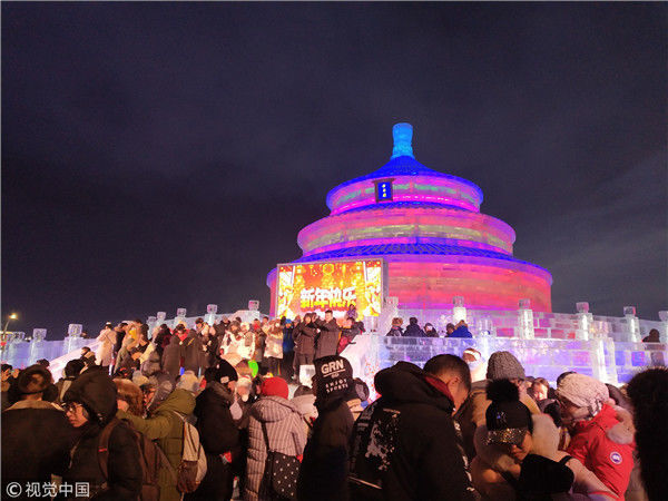 2017年12月31日,哈尔滨冰雪大世界亮灯迎新年,吸引大批游客跨年游玩。