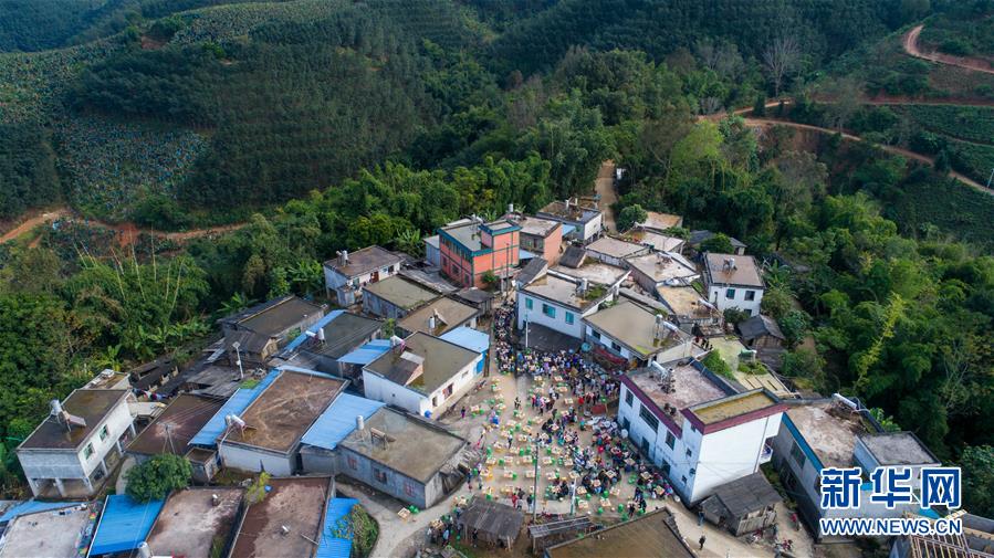这是无人机拍摄的云南省金平苗族瑶族傣族自治县者米乡地棚村小组。村民李发财家新建起了两层楼房,准备请前来贺喜的族人吃饭,村里十分热闹(11月13日摄)。 新华社记者 胡超 摄