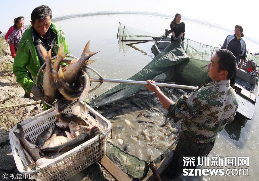 深圳新闻网讯 江苏扬州,邗江区公道镇南湖村南湖水域,专业捕捞队人员已集结到胡登强养殖户家鱼塘进行捕捞作业。据捕捞队员沈昌田介绍,近期随气温转冷,鱼的销量增加,水产养殖户纷纷捕鱼上市,为赶在上午10时将鱼运到水产批发市场销售,专业捕捞队员们天不亮就起床,下河塘布围网、收网捞鱼、过秤装车。一周捕捞作业有三四次之多,一次捕捞多达上万斤鱼。公道镇有水面滩涂6.5万亩,是鱼、虾、蟹、等水产品养殖的理想场所。