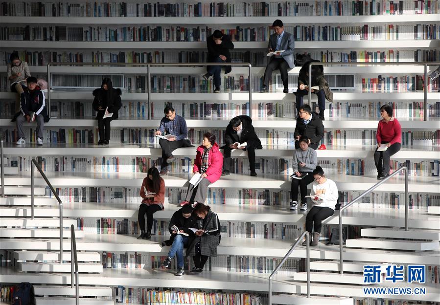 12月27日,读者在天津滨海新区图书馆中庭的“书山”上看书。 滨海新区图书馆位于天津滨海文化中心,2017年10月1日正式开馆,设计立意为“滨海之眼”和“书山有路勤为径”。图书馆现有藏书60多万册,一年多来接待读者约280万人次,已成为滨海新区的文化“新地标”。 新华社记者伍婧丹摄