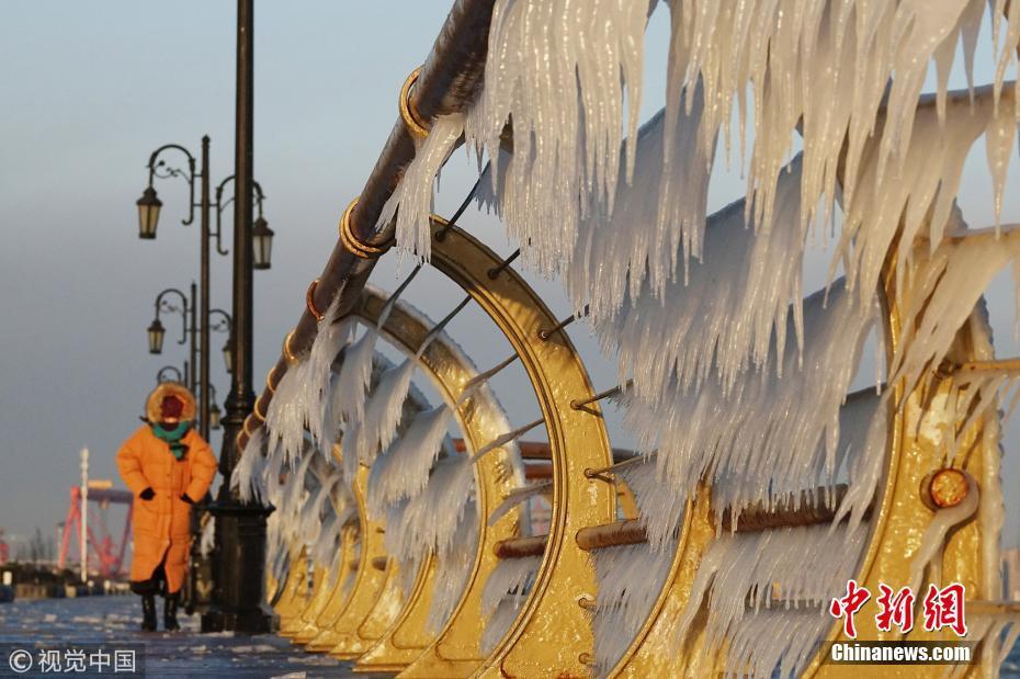 渤海海水在北风的作用下涌向岸边,在大连东港海岸护栏上凝结成冰凌,形成约有两公里的冰凌奇观。图为大连市东港海岸护栏结满晶莹剔透的冰棱。图片来源:视觉中国