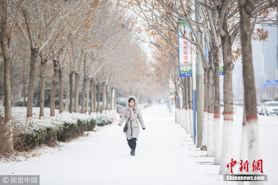 山东滨州发布道路结冰黄色预警信号市区出现较明显降雪,路表温度低于0℃。图片来源:视觉中国