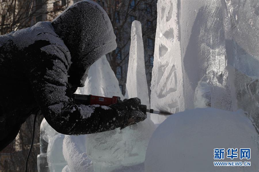 12月27日,来自东北石油大学的选手在比赛中完善冰雕作品。 当日,第十六届黑龙江省大学生冰雕艺术设计创作大赛在哈尔滨兆麟公园落下帷幕,全省高校共有99支队伍参赛。 新华社记者曹霁阳摄