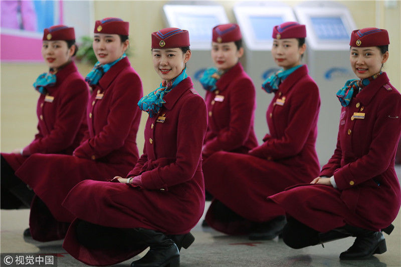 2018年12月27日,四川成都,为备战即将开通的成雅铁路,中国铁路成都局集团有限公司成都客运段动车二队对成雅动车的乘务人员进行理论、形体、服务礼仪等内容的培训。苏志刚/视觉中国