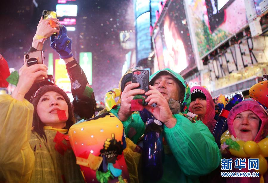 1月1日,在美国纽约时报广场,人们在雨中参加跨年活动。 新华社记者秦朗摄