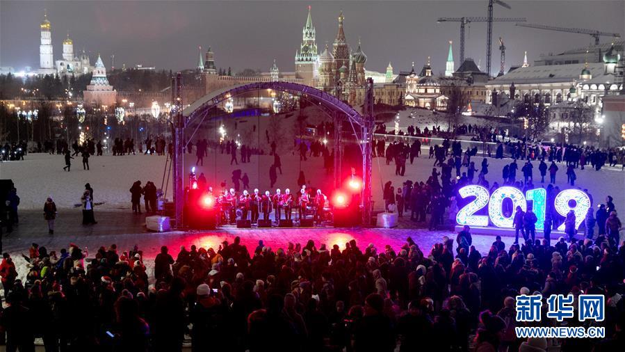 1月1日,在俄罗斯首都莫斯科,人们参加迎新年活动。 新华社记者白雪骐摄