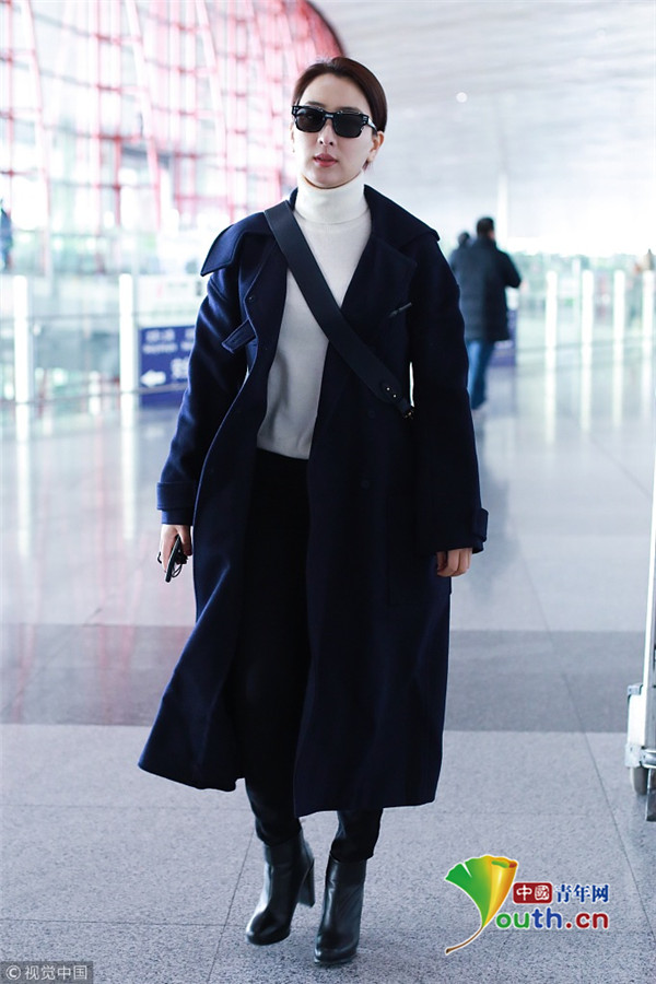 2019年1月7日,北京,马苏现身机场。她身穿黑色到脚大衣霸气外露,架黑超涂红唇似帅气“女特工”。