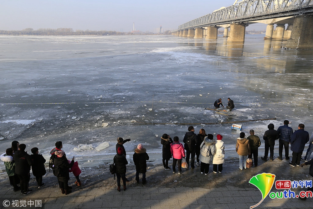 2018年11月25日,黑龙江省哈尔滨市,松花江封江不久,已经有人蹬江凿冰下网捕鱼。 图片来源:视觉中国