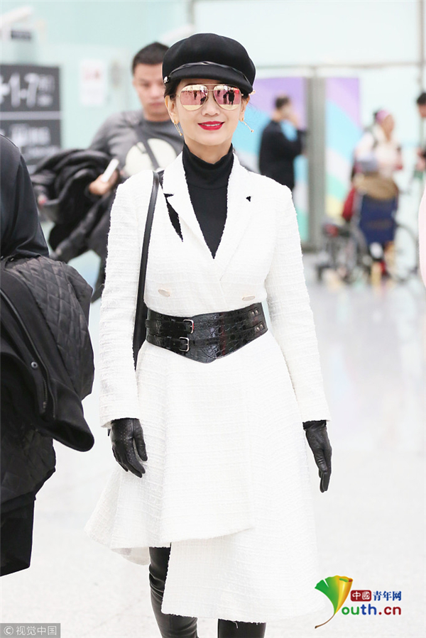 1月10日,广东省深圳市,赵雅芝夫妇现身深圳宝安机场,头戴贝雷帽的她架着反光墨镜,一袭白色不规则连衣裙配上黑色腰封及皮靴,酷似甜美女教官!