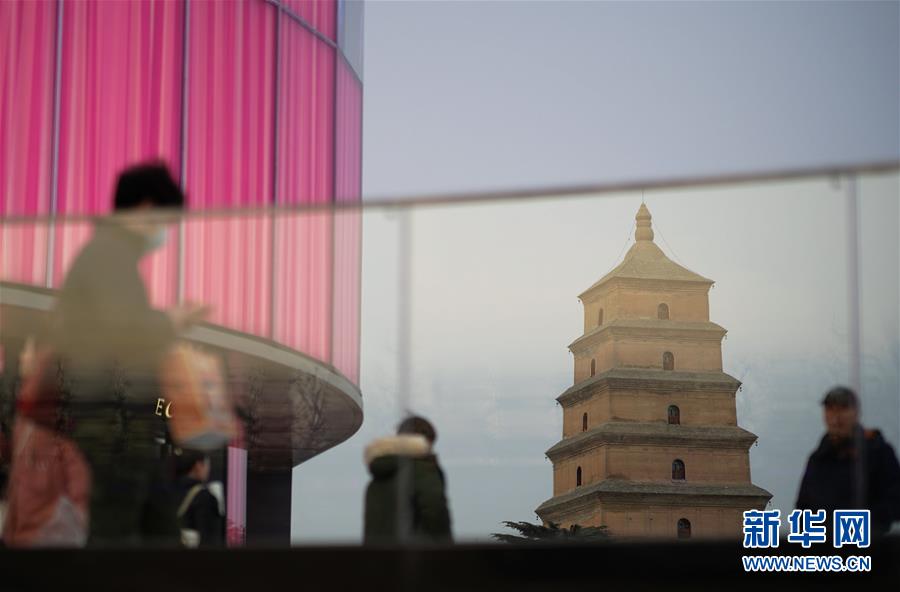改造后的商圈建筑“邂逅”大雁塔(1月15日摄)。 随着时代发展,西安著名历史遗迹大雁塔的周边商圈也历经变迁。通过近年来的改造提升,大雁塔商圈如今焕然一新,新潮时尚的大型商业综合体和商业街区为古老的大雁塔注入了现代活力,也为来大雁塔游玩的游客提供了更好的旅游体验。 新华社记者 邵瑞 摄