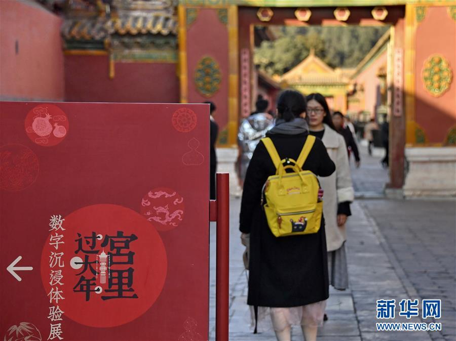 1月25日,游人在故宫内参观游览。 春节将至,北京故宫博物院内张灯结彩,到处悬挂着宫灯、万寿灯、年画、门神、福字等古代宫廷节日装饰品,让来自国内外的游人感受到浓浓的年味。 新华社记者 李欣摄