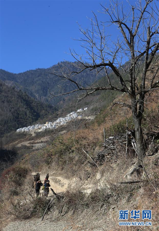 1月25日,在云南省兰坪县,余永妹(右)和褚福妹背柴回家,远处是她们即将易地搬迁的新居。