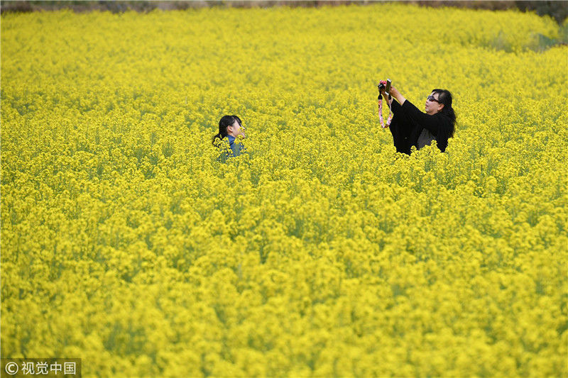 2019年3月1日,游客在花海中拍照。近日,位于云南省安宁市的大片油菜花进入盛花期,吸引民众到此赏花。