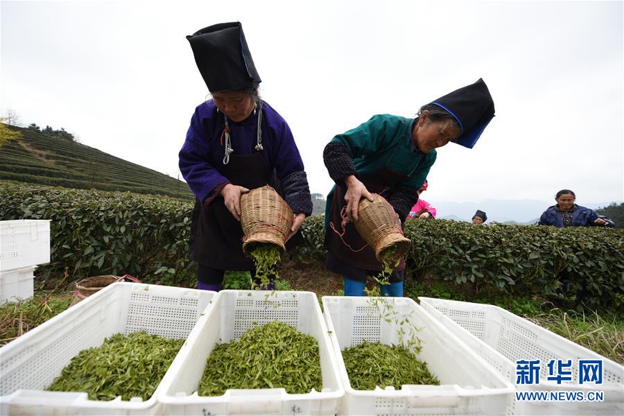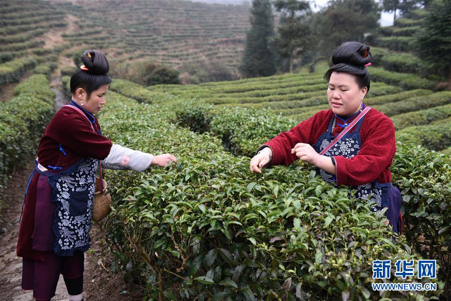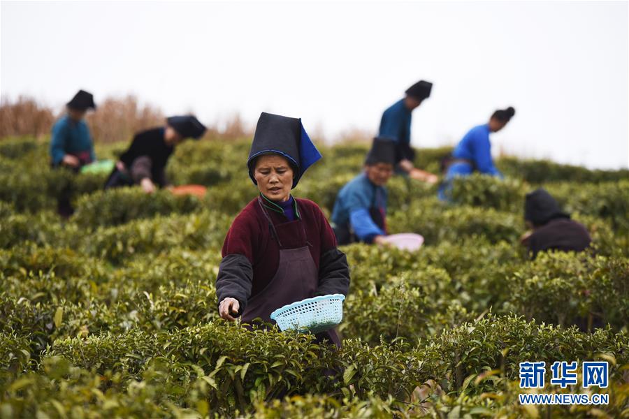 近日,随着气温回升,贵州省黔东南苗族侗族自治州丹寨县“扶贫茶园”的春茶陆续进入采摘期。 2018年以来,丹寨县创新产业扶贫模式,采取社会公众线上认领茶园,茶园聘请当地贫困户务工的“扶贫茶园”模式,为该县贫困户创造茶园管理、采茶、制茶等就业机会,帮助贫困户增收。 新华社记者 杨文斌 摄