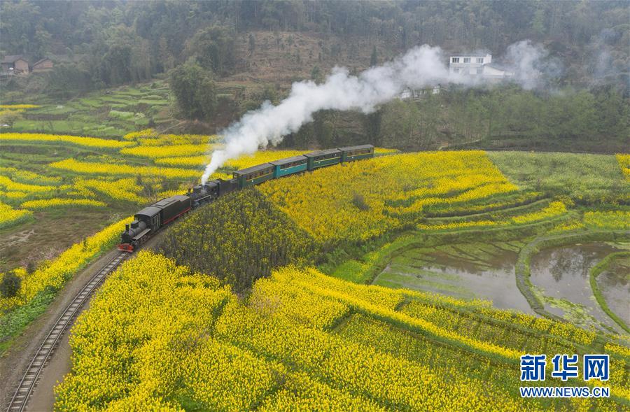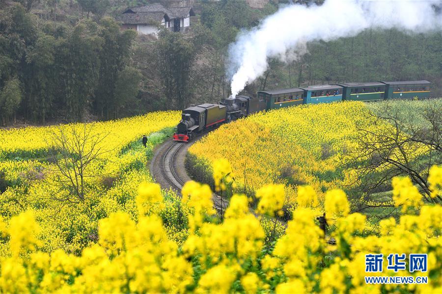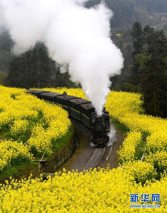 3月20日,一列嘉阳小火车在油菜花丛中穿行。