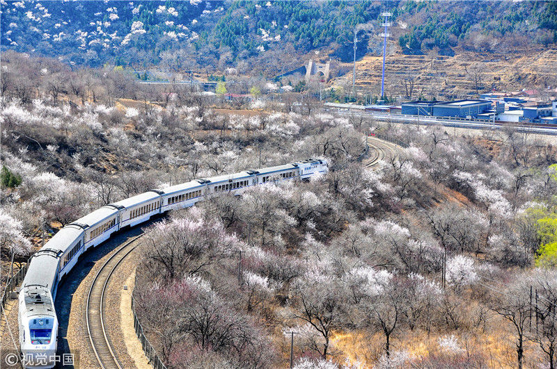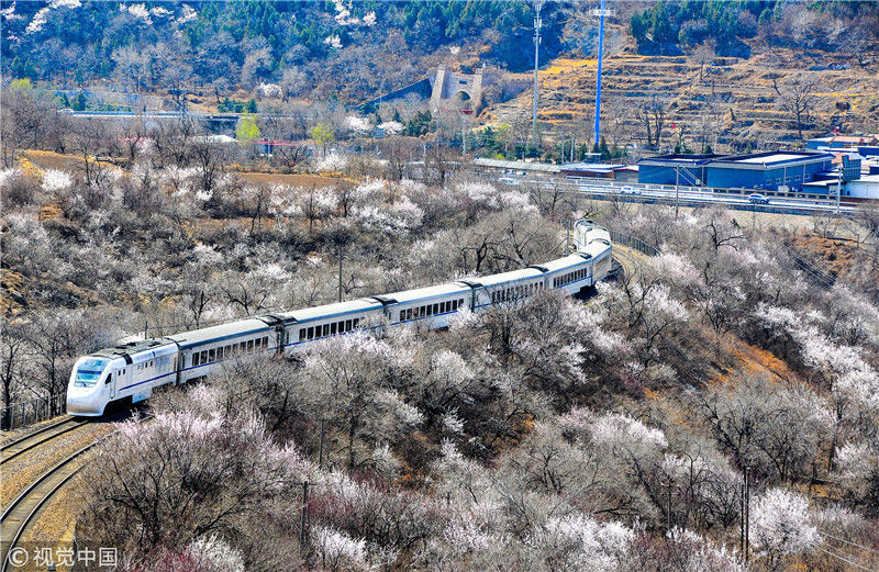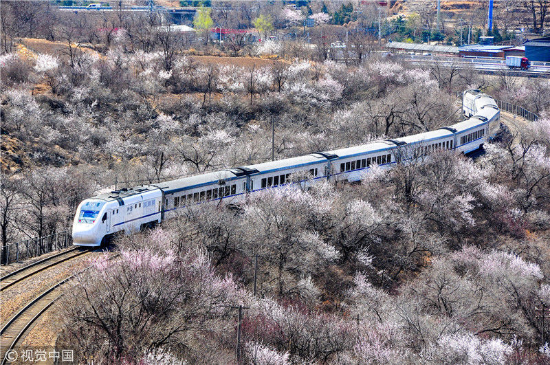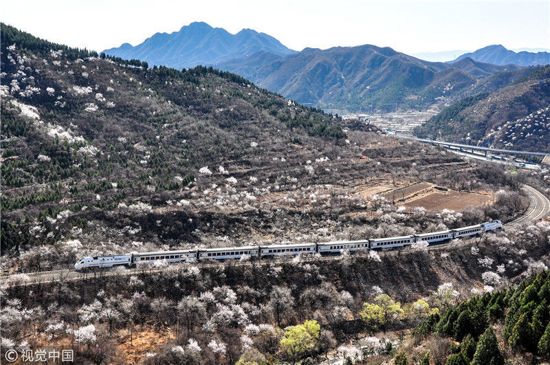 2019年3月22日,北京居庸关附近的山花盛开,S2线列车穿行在花海之中,构成一幅美丽的画面。时永平/千龙图像/视觉中国 编辑/陈进