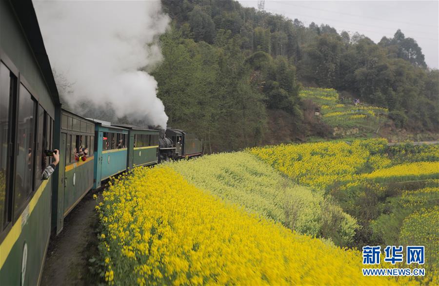 初春时节,在花海中穿行的嘉阳小火车迎来了每年的旅游旺季,众多游客慕名前来乘坐。