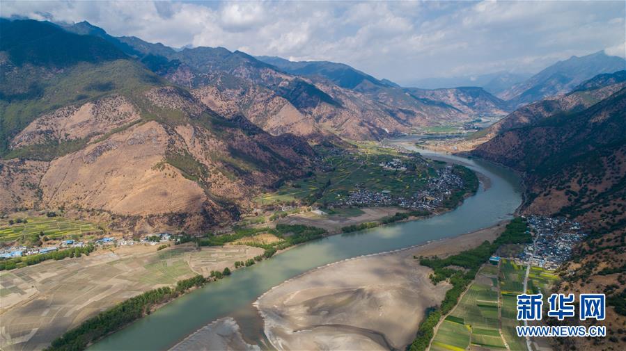 这是无人机拍摄的“长江第一湾”一景(3月17日摄)。“长江第一湾”位于云南省丽江市玉龙纳西族自治县石鼓镇,万里长江从青藏高原奔腾而下,与澜沧江、怒江一起在横断山脉的高山深谷中穿行形成并流的壮丽景观。金沙江在丽江石鼓镇突然以急转弯转向东北,形成一个宛若“V”字形的大转弯,得名“长江第一湾”。春日里,“长江第一湾”江水青碧,美景迷人。 新华社记者胡超摄