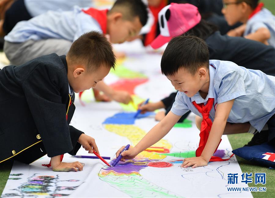 6月5日,陕西师范大学附属小学的学生在长卷上画龙舟。新华社记者 张博文 摄