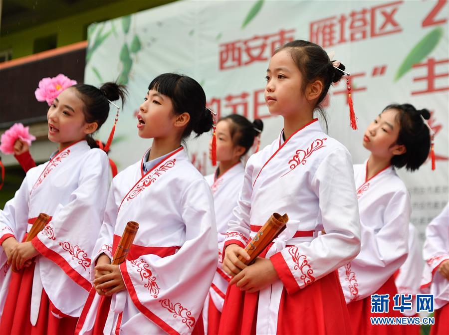当日,陕西师范大学附属小学在位于西安的校园里举行传统民俗活动迎接即将到来的端午节。